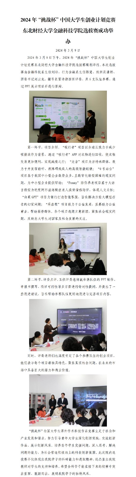 2024年“挑战杯”中国大学生创业计划竞赛东北财经大学金融科技学院选拔赛成功举办